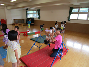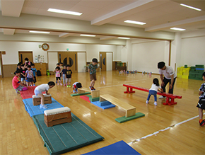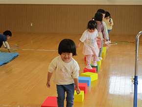 マット運動、跳び箱、縄跳び、鉄棒、巧技台 など保育の中で積極的に取り組み、身体作りや敏捷性・平衡感覚・瞬発力などを養います。