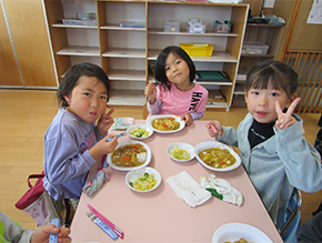 0~2歳児は完全給食、3歳児以上は副食給食(主食のみ持参)です。