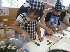 収穫した野菜でクッキングし食べます。栄養士による食べ物のお話もあります。