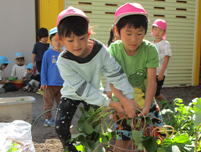 様々な野菜の苗を植え、収穫を行い、実際に野菜ができるまでを体験。